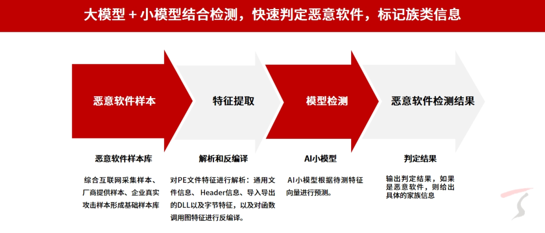 通过向AI大模型构建的TAI智慧引擎进行亿级海量文件和流量样本的投喂、训练,实现了对网络环境中恶意程序、恶意加密流量、DGA恶意域名以及HTTP隐蔽隧道等威胁的高效精准检测。
