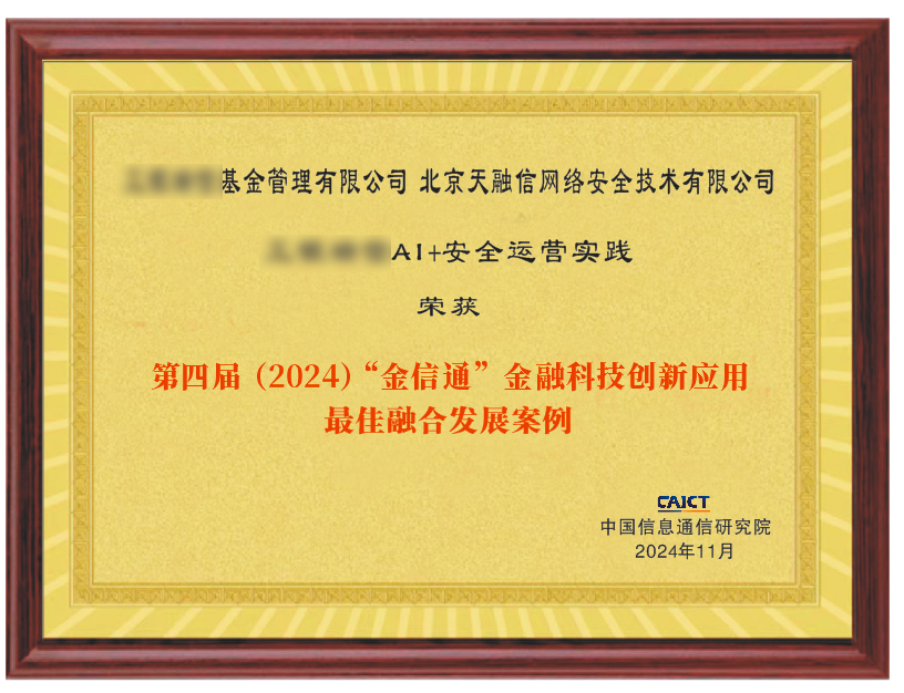 金融业是数据密集型行业,大规模、高质量的数据资源和多元化的应用场景也使其成为了数字化转型、大模型应用探索的“先驱者”。“某基金管理公司AI+安全运营实践”荣获第四届(2024)“金信通”金融科技创新应用最佳融合发展案例,树立了行业标杆,更是进一步推动金融行业向智能化、安全化方向迈进,为金融科技的持续创新与发展注入新的活力。