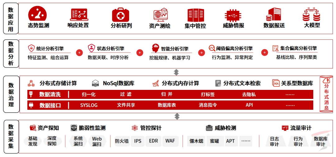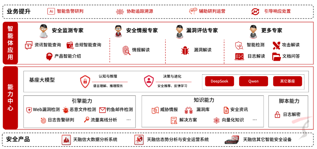 通过AI与大数据技术的深度融合,依靠由大模型生成的各类智能体,构建起“多层级多角色协同”的安全运营体系,持续优化安全策略,构建安全流程,以自然语言交互大幅提升人员支撑效率,使监测更便捷、分析更智能、响应更高效、配置更简单、交互更直观,帮助客户进行安全运营建设。