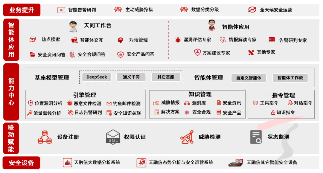 天融信天问大模型是一款面向网络安全领域的安全大模型产品,提供天问工作台、基座模型管理、智能体管理、引擎管理、知识管理、指令管理以及漏洞评估、情报解读、告警研判等多个安全智能体应用,帮助客户打造私有化安全大模型平台。产品通过服务接口为天融信智算一体机、天融信大模型安全防护网关、天融信大数据分析系统等安全设备联动赋能,帮助客户构建智能化的安全运营防护体系,提升安全运营效率。