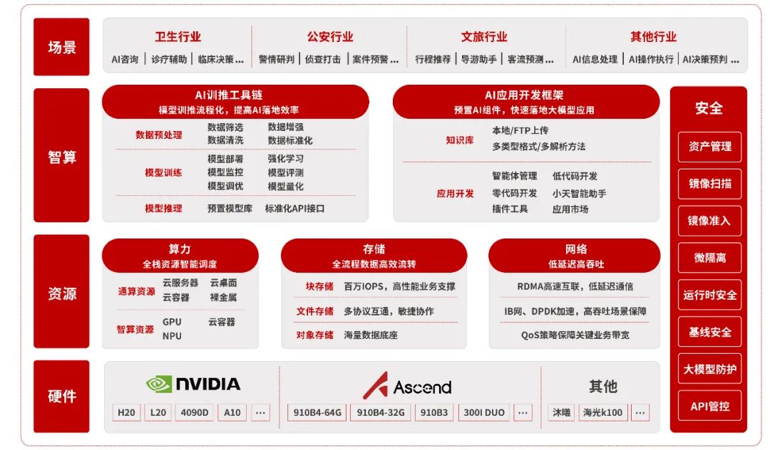 天融信智算一体机以“AI算力硬件+天融信智算云平台”为基础,融合智算与安全两大能力,提供高效易用的AI基础设施和安全可靠的AI开发环境,助力企业快速安全落地大模型应用。产品配备全栈式AI训练与推理工具链,支持多种大模型开发框架,覆盖本地知识库搭建、智能问答、智能体开发及生成式工作流等应用场景,可帮助客户轻松构建智能化应用,加速大模型的部署与应用。在安全方面,产品集成API安全防护、容器运行安全防护、镜像扫描与准入、基线安全及10余项安全网元,为企业安全开展业务创新提供有力支持。