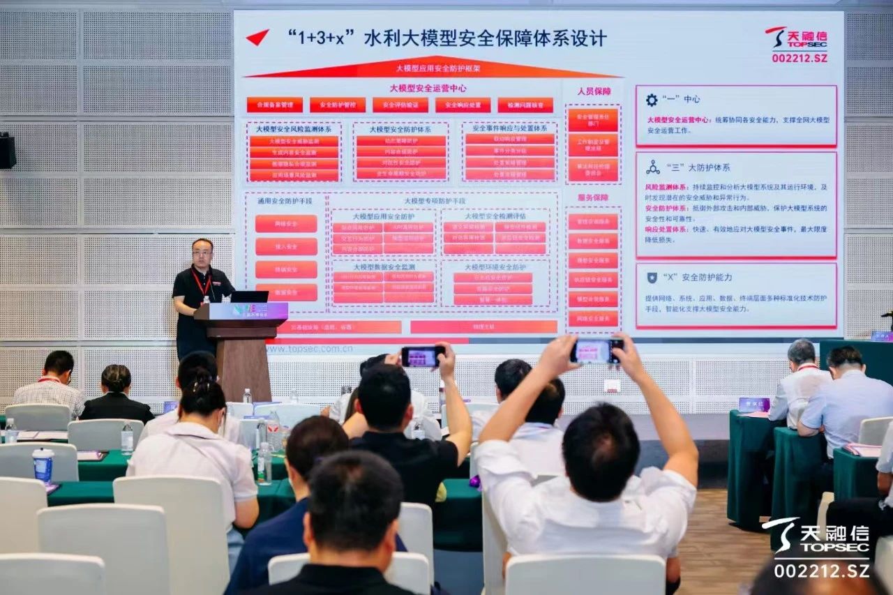 近年来,水利行业也在深度探索AI+新范式。演讲最后,袁留记提到,天融信自2014年开始开展AI技术在产品中的工程化应用,目前已打造了包含天问大模型系统、产品小天、云上小天、智算云平台、大模型安全防护等在内的“AI+”创新实践,为水利行业高水平安全与高质量发展保驾护航。
