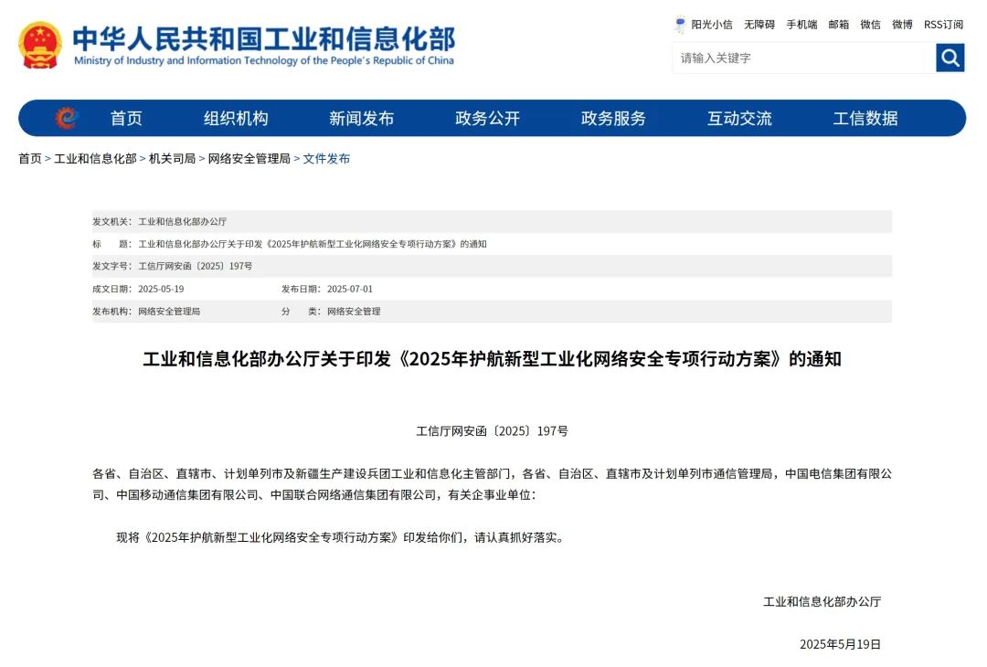 在新型工业化加速推进的关键时期,网络安全已成为产业高质量发展的核心支撑。近日,工业和信息化部印发《2025年护航新型工业化网络安全专项行动方案》(以下简称《专项行动方案》),旨在提高工业领域网络安全保障水平,支撑制造业高质量发展,为实现“十五五”良好开局奠定坚实基础。