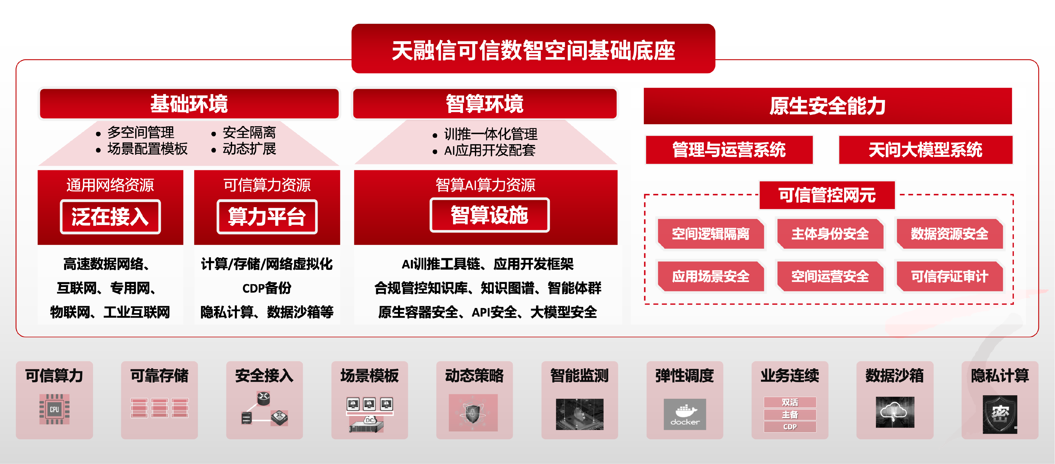 「天融信可信数据空间“网算智安”基础底座」可提供泛在网络接入、可信算力资源、智算算力设施以及原生安全一体化的算力基础资源,为可信数据空间建设提供了安全原生的基础运行环境,并基于数智化标签标识的可信数智空间管控体系框架,实现全流程一致的数智化管控。同时,通过AI协同的可信数智空间智能化运营,建立动态适配的智能平台运营机制,为可信数据空间建设提供关键支撑。