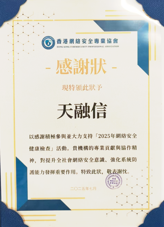 身处全球数据与信息流动的关键枢纽,香港的网络安全韧性对区域乃至全球都至关重要。未来,天融信坚持创新驱动发展,持续提升网络安全产品品质、提高网络安全运营效率,为政府、企事业单位及科研院校等提供常态化安全服务支撑,为助力香港数字安全体系建设贡献企业力量。