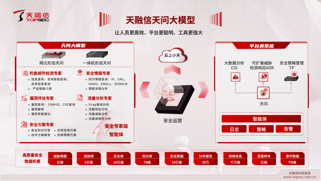目前,天融信天问大模型系统已完全集成了包括流量安全、邮件安全在内的各类自研模型引擎,以天问基座大模型、智算云平台、云上小天等多形态矩阵,为各关键行业输送可持续的智能安全动能。