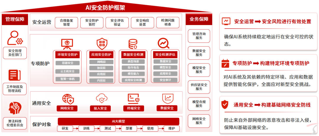 增强一体化安全运营管控:通过对通用安全和专项防护进行一体化安全运营与管控,实现对AI大模型的全生命周期管控,以及实时检测、协同联动、主动防护的体系化防护。
