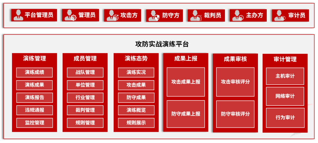 为满足网络安全靶场的建设要求, 天融信 研发了攻防实战演练系统,围绕攻防演练活动的前、中、后三个阶段,为攻击方、防守方和裁判方等各类角色提供综合演练工作平台,以实现攻防演练成果评判流程化和进程可视化。