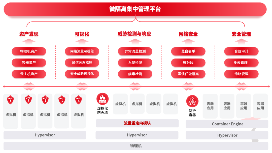 针对混合云与虚拟化环境下东西向流量不可见、内部威胁难防范、策略管理粒度粗放等安全痛点, 天融信 应用网络虚拟化安全技术研发了微隔离管理平台,以“零信任,微隔离”为核心构建体系化解决方案。平台全面兼容飞腾、麒麟等国产化软硬件环境,创新采用有代理与无代理混合部署模式,可灵活适配高并发、流量复杂的网络场景,实现对物理机、虚拟机、云主机、容器及混合环境的细粒度访问控制。