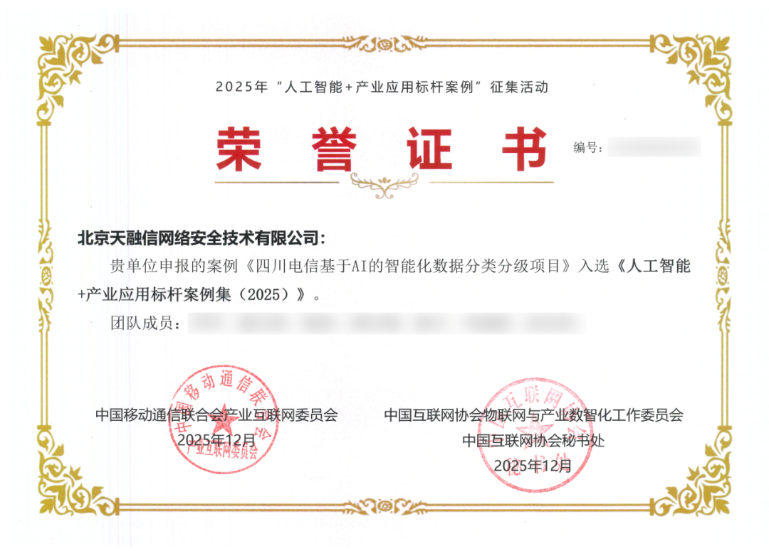 近日,由中国互联网协会、中国移动通信联合会联合组织的“人工智能+产业应用标杆案例”征集活动结果正式揭晓。天融信凭借在人工智能与网络安全融合领域的卓越实践荣获“人工智能+标杆单位”称号,三大核心应用案例成功入编《人工智能+产业应用标杆案例集(2025)》。