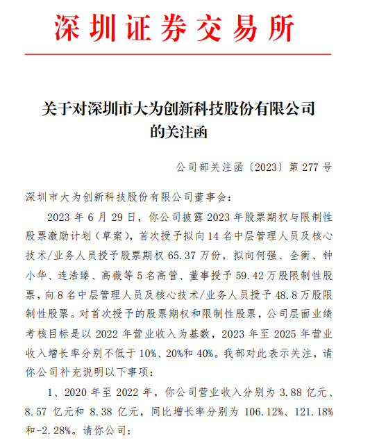 7月4日讯,发布股权激励计划不久,大为股份便收到了深交所下发的关注函。