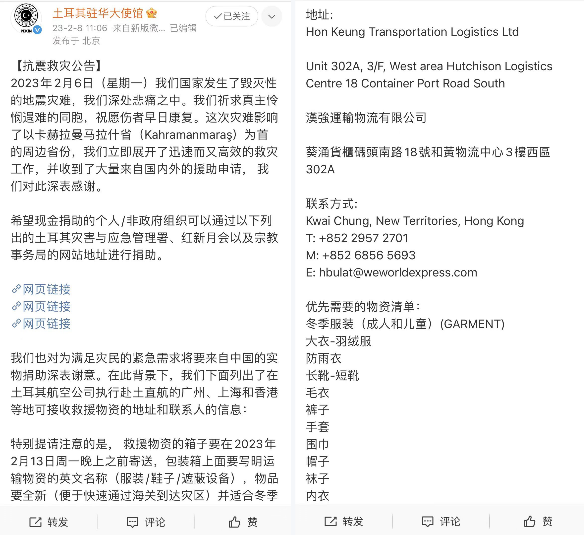 24小时的马不停蹄,1天1夜的昼夜不息,2月13日下午3点,捐赠物资成功运达指定货仓。广州分公司负责人与专车汇合,细心清点货物数量,仔细检查货物情况,最终交接给土耳其驻广州领事馆,成功完成了本次物资捐赠。