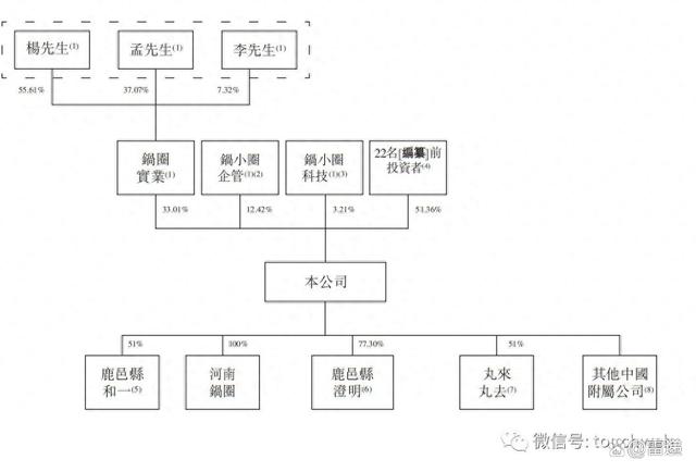 IPO前,杨明超、孟先进及李欣华根据彼等之间的一致行动人士协议,通过锅圈实业(上海)有限公司(锅圈实业),共同于已发行股本总额中拥有约33.01%权益,而杨明超亦通过上海锅小圈企业管理中心(有限合伙)(「锅圈企管」)及上海锅小圈农业科技服务中心(有限合伙)(「锅小圈科技」)分别于已发行股本总额中拥有约12.42%及3.21%权益。