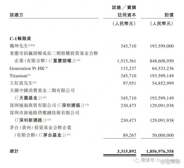 锅圈食品在2021年8月30日完成18.57亿C-1轮融资,每股成本为4.4元,其中,魏坤认购1.94亿元,重庆朗曜认购8.49亿元,Generation Pi HK认购6453万元,TPG旗下Titanium认购1.94亿元,王洪波认购5485万元,天图中国消费基金二期有限公司认购1.94亿元,物美科技旗下深圳通福商贸有限公司认购1.29亿元,多点Dmall旗下深圳市新通路供应链技术有限公司认购1.29亿元,茅台基金认购5000万元。
