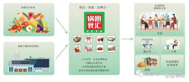截至2023年4月30日,锅圈的产品组合包括八大类别,包括火锅产品、烧烤产品、饮料、一人食、即烹餐包、生鲜食品、西餐和零食,合共710个SKU。锅圈全国范围内销售的产品中有约95%为锅圈食汇自有品牌产品。