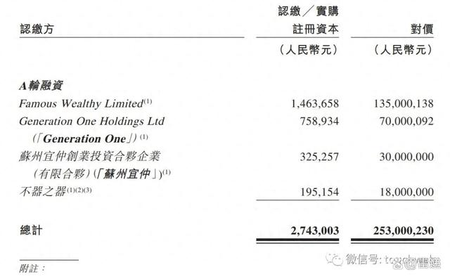 2020年8月20日完成2.53亿元A轮融资,每股成本为0.73元,其中,IDG旗下Famous Wealthy Limited认购1.35亿,卫哲旗下Generation One Holdings Ltd认购7000万元,苏州宜仲认购3000万元,不器之器认购1800万元。