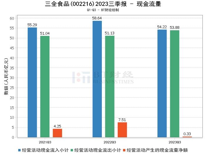 在现金流量方面,2023年三季度,三全食品的经营活动产生的现金流量净额为3312.61万元,较上年同期的7.51亿元大幅下降。经营活动现金流入小计为54.22亿元,较上年同期的58.64亿元有所下降。经营活动现金流出小计为53.88亿元,较上年同期的51.13亿元有所增长。这表明公司的现金流量状况存在一定的压力。