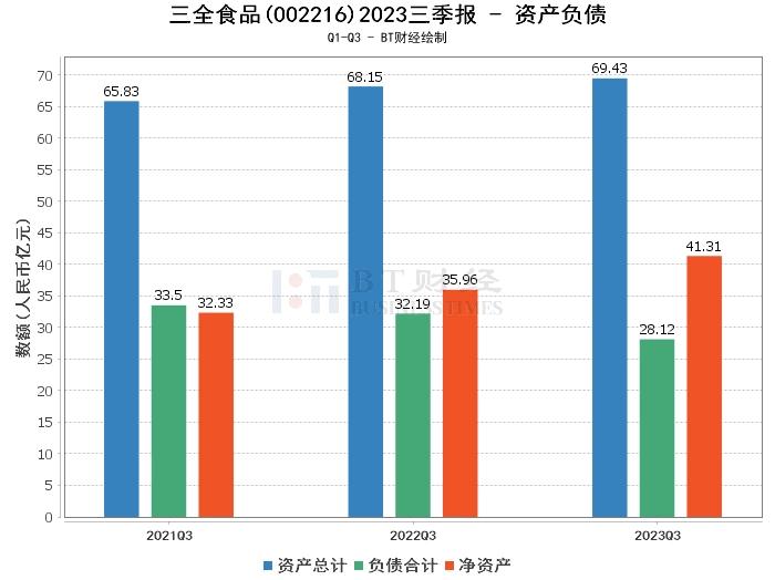 在资产负债方面,2023年三季度末,三全食品的总资产为69.43亿元,相比上年度末的75.31亿元有所下降。负债合计为28.12亿元,较上年度末的36.5亿元减少。净资产为41.31亿元,相比上年度末的38.81亿元有所增长。资产负债率为40.5%,较上年度末的48.47%有所下降。这表明公司的负债水平在降低,资产结构正在优化。