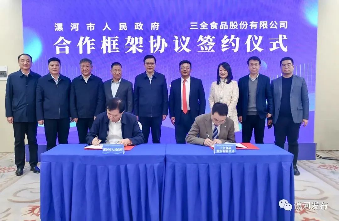 11月16日,漯河市政府与三全食品股份有限公司合作框架协议签约仪式举行。市委书记秦保强出席仪式并会见三全食品股份有限公司董事长陈南一行。市领导周新鹤、王继周参加。