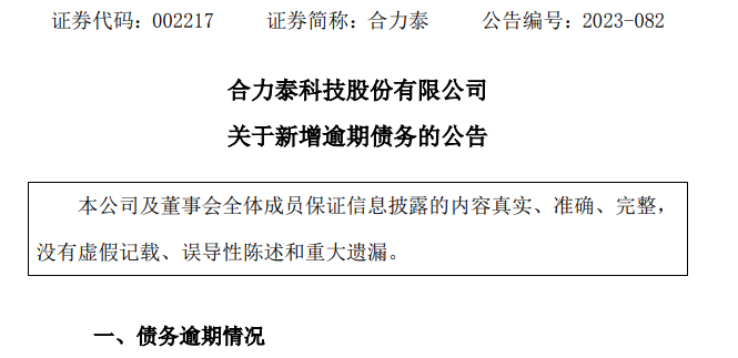 近日,触控显示巨头-合力泰科技股份有限公司(简称:合力泰)发布了一则关于新增逾期债务的公告。公告显示,自2023年9月23日至2023年11月3日,合力泰及子公司在银行、融资租赁公司等金融机构累计的新增逾期债务金额折合人民币为6.39亿元,占公司2022年经审计净资产的11.65%。