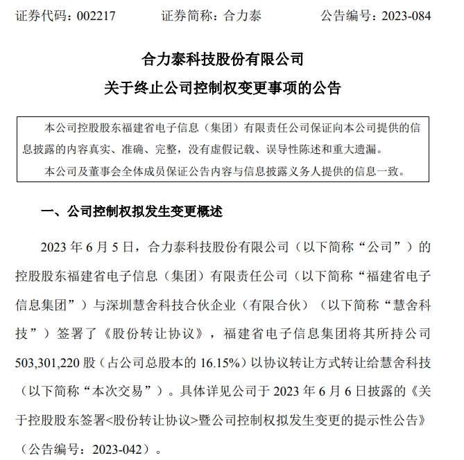 今年3月16日,合力泰发布控股股东筹划重大事项的停牌公告。随后在6月,合力泰控股股东福建省电子信息集团与慧舍科技签署了《股份转让协议》,福建省电子信息集团将其所持公司约16.15%的股份,以协议转让方式转让给慧舍科技。