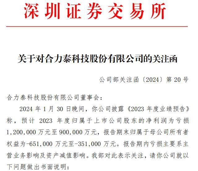 中新经纬1月31日电 30日晚,深交所向合力泰下发关注函,涉及业绩预告相关内容。