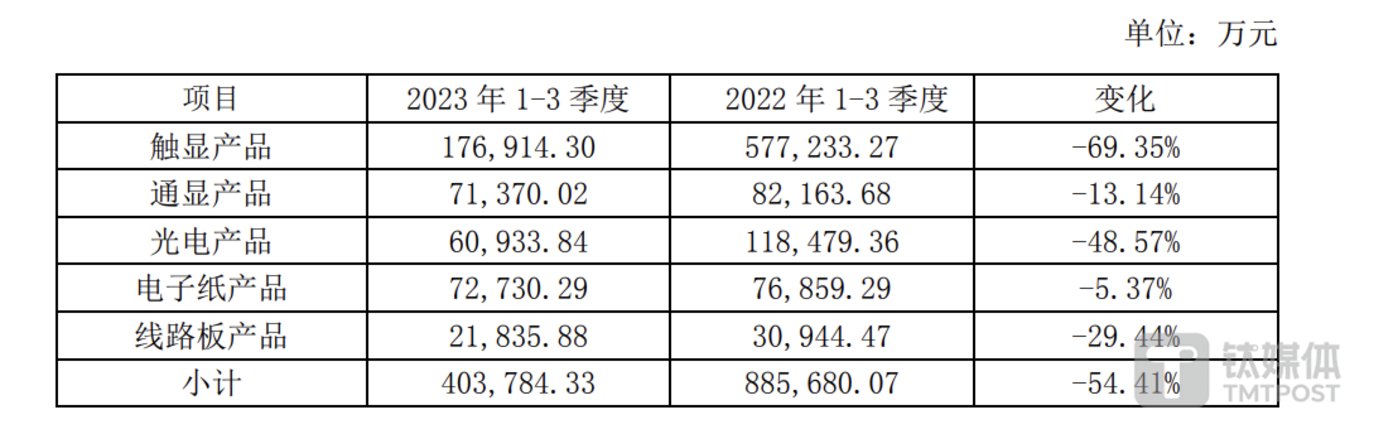 具体来看,合力泰2023年1-9月份实现营业收入41.46亿元,同期下滑54.16%。若分产品来看,合力泰主营产品为触显产品、通显产品、光电产品、电子纸产品、线路板产品五大类,2023年前三季度,公司上述五大产品的销售额均出现下滑。其中,触显产品和光电产品销售额下滑明显,分别同比下滑了69.35%、48.57%。