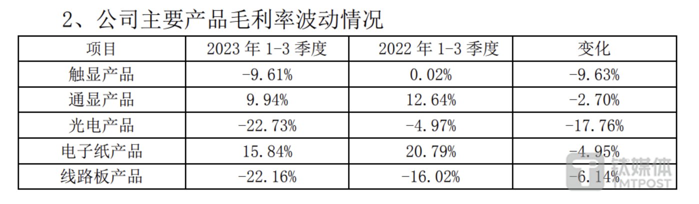 分产品看,报告期内,公司五大产品的毛利率均出现下降,其中触显产品、光电产品、线路板产品的毛利率下滑幅度较大,毛利率分别为-9.61%、-22.73%、-22.16%,处于亏本状态。