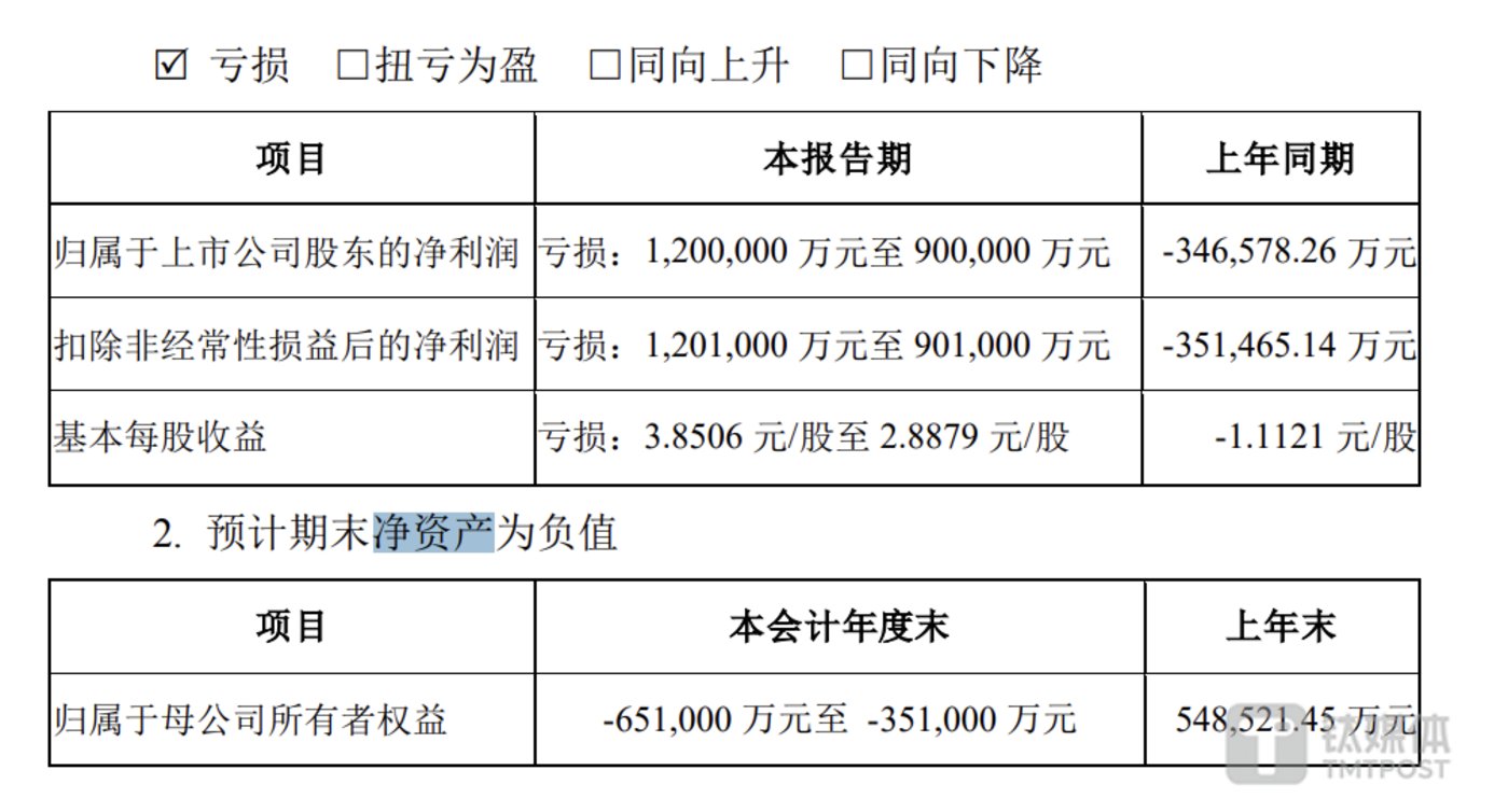 据公司2023年业绩预告显示,公司预计2023年归母净利润亏损90亿至120亿元,且预计2023年末净资产为负值。值得注意的是,若合力泰2023年度经审计的期末净资产为负值,据相关规定,在披露2023年年度报告后公司股票交易将可能被深圳证券交易所实施退市风险警示。