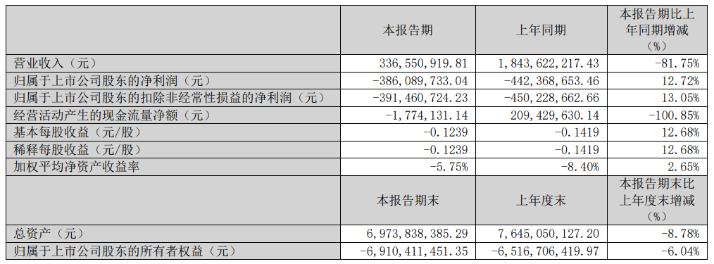 报告期内,公司实现营业收入 46.30 亿元,较上年同期减少 61.12%;归属于股东的净利润-119.91 亿元,较上年同期减少 246.02%;经营性现金流净额 2.64 亿元,较上年同期减少 50.97%,期末归母净资产为-65.17 亿元。