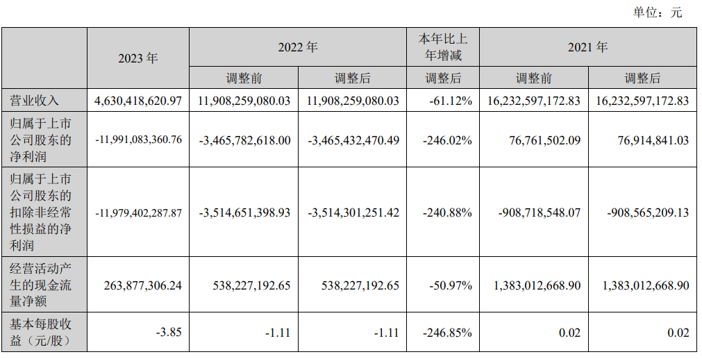 4月30日发布年度业绩报告称,2023年营业收入约46.3亿元,同比减少61.12%;归属于上市公司股东的净利润亏损约119.91亿元;基本每股收益亏损3.85元。