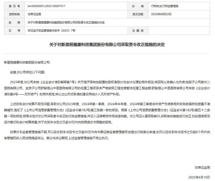 6月20日,甘肃证监局官网发布行政监管措施决定,对新里程健康科技集团股份有限公司采取责令改正措施,原因是公司财务会计核算不规范导致2023年度至2024年第三季度财务数据披露不准确。