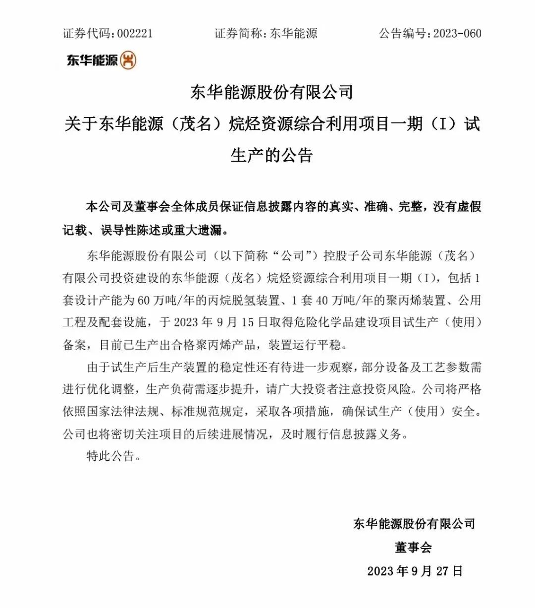 2023年9月27日,东华能源发布公告称,东华能源(茂名)烷资源综合利用项目一期(I),包括1套设计产能为60万吨/年的丙烷脱氢装置、1套40万吨/年的聚丙烯装置、公用工程及配套设施,于2023年9月15日取得危险化学品建设项目试生产(使用)备案,目前已生产出合格聚丙烯产品,装置运行平稳。