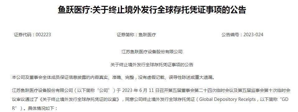 6月11日,鱼跃医疗发布公告称,考虑到国内外市场变化,通过对公司实际财务及经营情况、资金需求以及长期业务战略规划进行全面审视,公司决定终止境外发行全球存托凭证(GDR)事项。