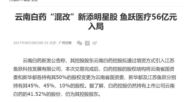 2017年6月6日,云南白药公告称,江苏鱼跃拟单方面向公司控股股东白药控股增资56.38亿元,由此获取持有10%的股权。同时,吴光明和吴群分别持有江苏鱼跃95%和5%的股份。至此,白药控股的股东囊括了云南省国资委、新华都、江苏鱼跃三方,它们的持股比分别为45%、45%、10%。