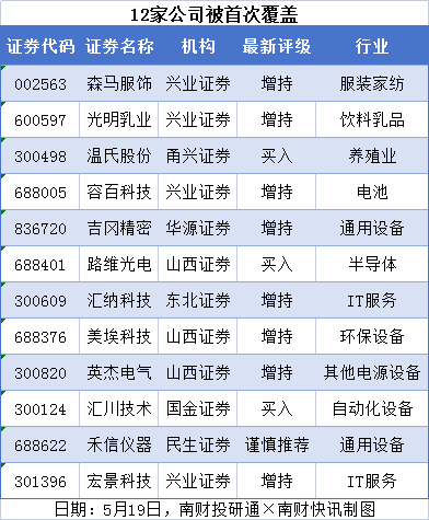 首次覆盖方面,5月19日券商共给出了12次首次覆盖,其中森马服饰、光明乳业获得兴业证券给予“增持”评级,温氏股份获得甬兴证券给予“买入”评级,容百科技获得兴业证券给予“增持”评级,吉冈精密获得华源证券给予“增持”评级。