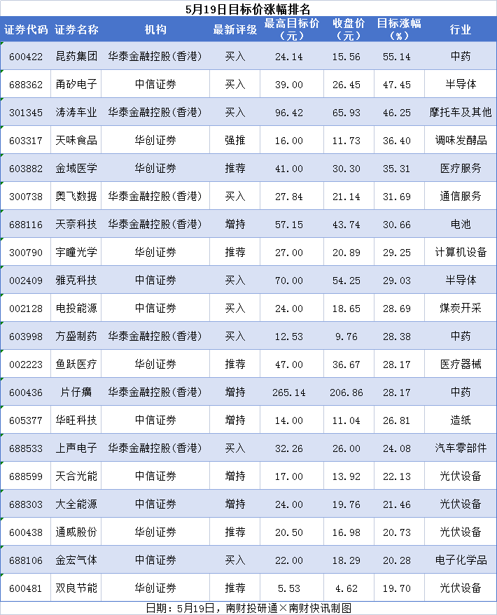 5月19日,券商给予上市公司目标价共39次,按当日收盘价计算,目标价涨幅排名居前的公司有昆药集团、甬矽电子、涛涛车业,目标价涨幅分别为55.14%、47.45%、46.25%,分别属于中药、半导体、摩托车及其他行业。