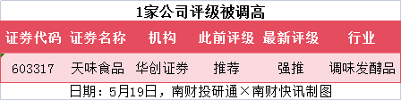 评级调高方面,5月19日,券商调高上市公司评级达到1次,最新数据包括了华创证券对天味食品的评级从“推荐”调高至“强推”。