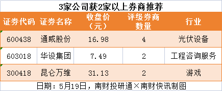 从券商推荐家数来看,5月19日有86家上市公司得到券商推荐,其中通威股份获得4家推荐,华设集团获得2家推荐,昆仑万维获得2家推荐。