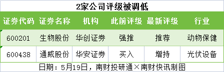 评级调低方面,5月19日,券商调低上市公司评级达到2次,最新数据包括了华创证券对生物股份的评级从“强推”调低至“推荐”,华安证券对通威股份的评级从“买入”调低至“增持”。