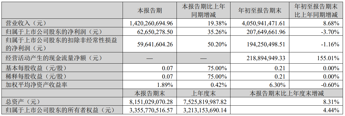 10月20日晚间,濮耐股份发布发布前三季度报告称,前三季度归属于上市公司股东的净利润为2.08亿元,同比减少3.7%;营业收入40.51亿元,同比增长8.68%;基本每股收益0.21元,同比增长0.0%。第三季度归属于上市公司股东的净利润为6265.03万元,同比增长35.26%;营业收入14.2亿元,同比增长19.38%。