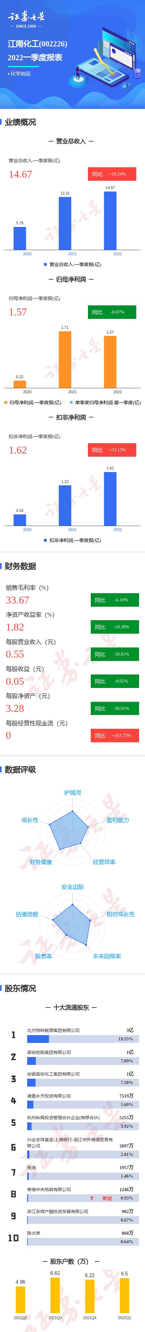 江南化工2022一季报显示,公司主营收入14.68亿元,同比上升10.24%;归母净利润1.57亿元,同比下降8.07%;扣非净利润1.63亿元,同比上升33.13%;其中2022年第一季度,公司单季度主营收入14.68亿元,同比上升10.24%;单季度归母净利润1.57亿元,同比下降8.07%;单季度扣非净利润1.63亿元,同比上升33.13%;负债率37.54%,投资收益40.99万元,财务费用3942.37万元,毛利率33.67%。