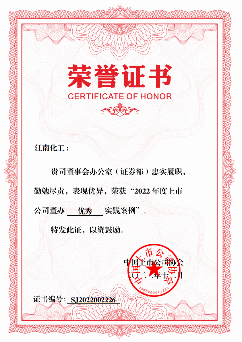 江南化工董事会秘书王敦福获“2022年上市公司董事会秘书履职评价4A级”,董事会办公室入选“2022年度上市公司董办优秀实践案例”。在A股5000余家上市公司中,仅有约6%获董事会秘书履职4A评级,约5%获董办优秀实践评价。