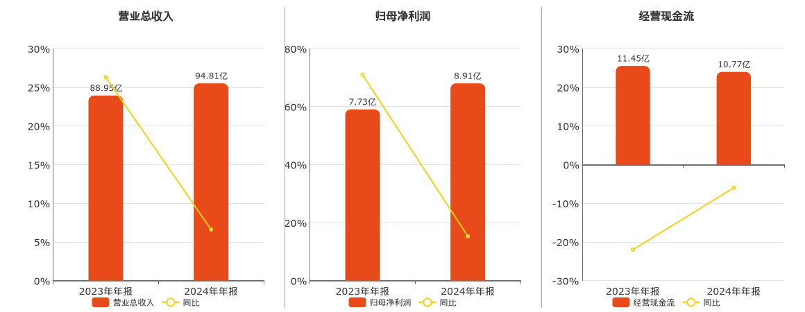 公司营业总收入为94.81亿元,较去年同报告期营业总收入增加5.86亿元,实现5年连续上涨,同比较去年同期上涨6.59%。归母净利润为8.91亿元,较去年同报告期归母净利润增加1.18亿元,实现2年连续上涨,同比较去年同期上涨15.26%。经营活动现金净流入为10.77亿元。