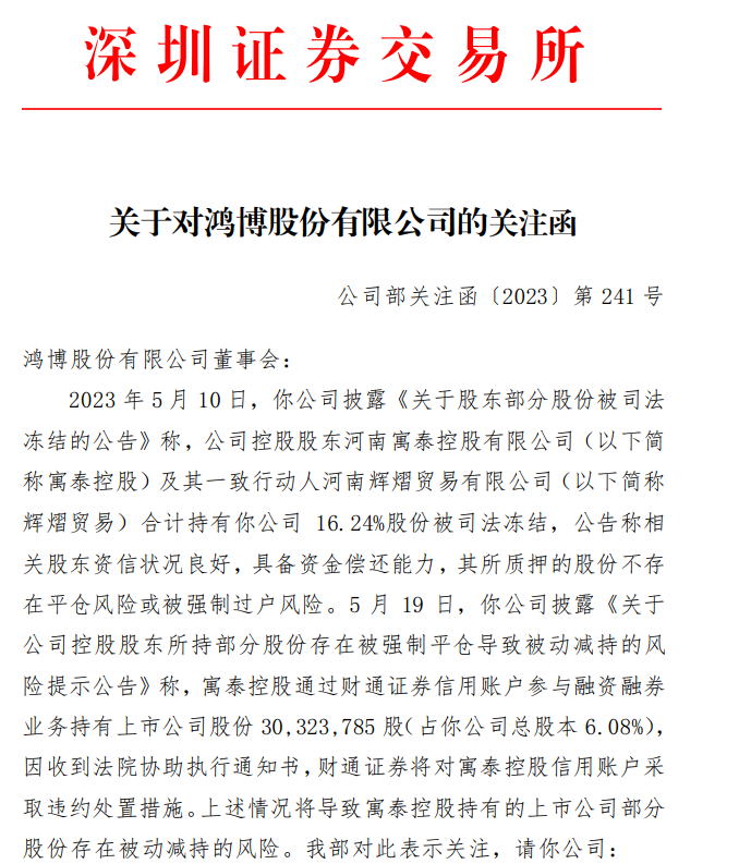 消息面上,5月22日晚,深交所向鸿博股份下发关注函,要求其说明控股股东存在强制平仓风险、实控人大笔转让股份并辞去公司全部职务等相关问题。