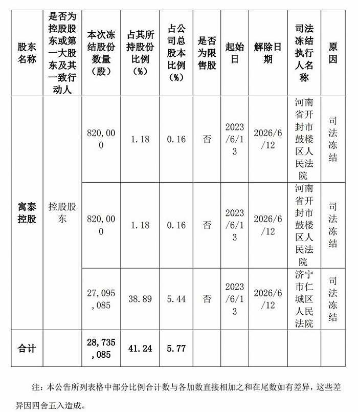 根据公告,本次增加冻结的股份分为三部分,合计2873.51万股,其中两部分均为82万股(合计164万股),司法冻结执行人均为河南省开封市鼓楼区人民法院,而另一部分2709.51万股的司法冻结执行人为济宁市仁城区人民法院。