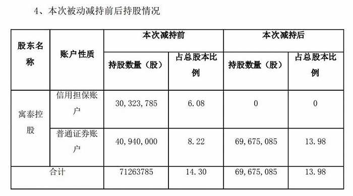 公告显示,该次被动减持的原因是:“因收到法院协助执行通知书,财通证券对寓泰控股在财通证券信用账户持有的部分公司股份进行强制平仓减持所致,减持获得资金全部用于归还寓泰控股在财通证券的融资。”也就是,寓泰控股并未按时归还财通证券相关负债,而是通过实施强制平仓来偿还。
