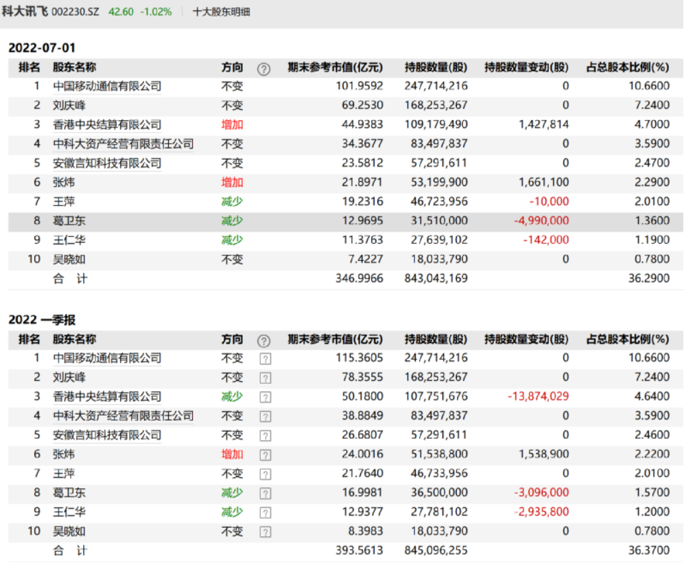 据choice数据显示,截至2021年年末,葛卫东的减持数量为883.4万股,持股比例降至1.7%;今年一季度葛卫东依旧未停止减持科大讯飞的脚步,再度减持309.6万股,持股比例又降至1.57%。