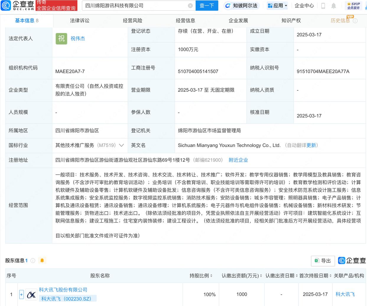 查询显示,近日,四川绵阳游讯科技有限公司成立,法定代表人为祝伟杰,注册资本1000万元,经营范围包含:软件开发;教学专用仪器销售;教学用模型及教具销售等。查询股权穿透显示,该公司由科大讯飞(002230)全资持股。