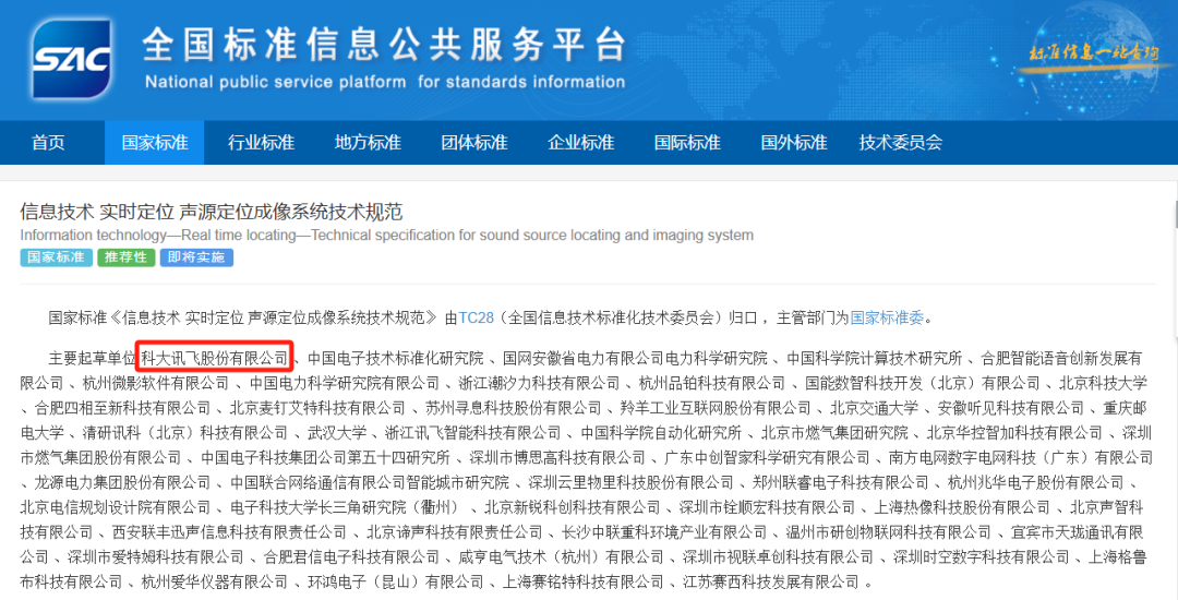 《规范》由全国信息技术标准化技术委员会归口,科大讯飞作为第一起草单位,联合中国电子技术标准化研究院、中国科学院计算技术研究所、中国电力科学研究院有限公司等多家知名企业与科研机构共同起草。《规范》系统性地规定了声源定位成像系统的架构、技术要求与测试方法,为设备研发、场景适配及数据互通提供了权威指引,进一步推动声学检测、声学定位在产业中良好发展,鼓励更多工业企业采用声学检测系统来代替传统检测,从而保障工业生产的安全性、高效性方面具有重要意义。